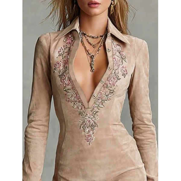 Denna förtrollande vintageklänning kombinerar romantisk elegans med bohemisk chic. Djup V-ringning framhäver halslinjen, medan delikata pärlknappar längs bysten ger diskret lyx. Det invecklade, handbroderade blombroderiet pryder kjolen och gör varje plagg unikt – en detalj som skiljer sig från massproducerade varianter. Tillverkad i lätt, luftigt material med en elegant A-linje-siluett och insvängd midja som skapar en feminin form. Perfekt som sommarfestklänning, bröllopsgäst-look eller romantisk date-outfit. Detta tidslösa plagg med exklusiv vintage-sofistikering garanterar att du fångar allas blickar och utstrålar självsäker femininitet.