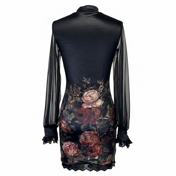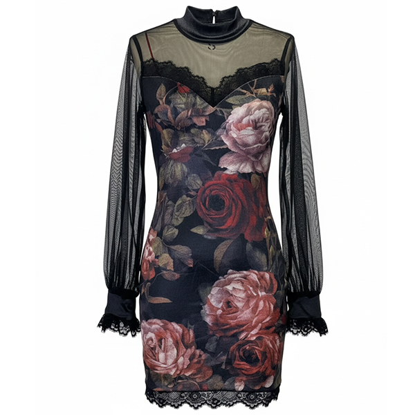 Romantisk blommönstrad klänning i skir gasbinda med handsydd, intrikat spetskant – en exklusiv vintageinspiration som skiljer dig från mängden. Lätt och luftig design formar sig smickrande efter kroppen, samtidigt som de eteriska lagren skapar en drömsk rörelse. Perfekt för trädgårdsfester, bröllop eller vardagslyx, med en oslagbar kombination av feminin elegans och tidlös charm.