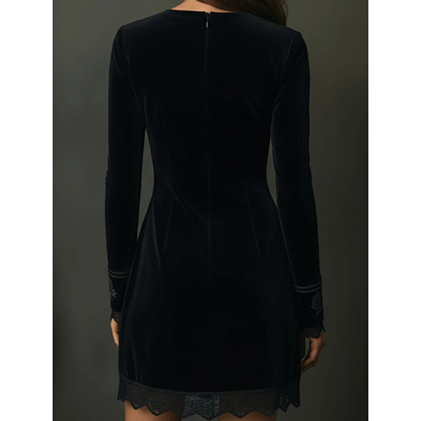 Den här klänningen har en vintagestil med lyxig sammetskonstruktion och ett romantiskt blommigt tryck för tidlös, elegant sofistikering. Den spetsiga fållen ger en delikat texturkontrast och feminin förfining. Vill du prova?