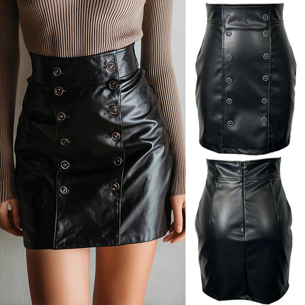 Upptäck vår konstläderminikjol med klassisk dubbelknäppt design – en perfekt mix av vintageinspirerad elegans och modern edge. Tillverkad i mjukt, högkvalitativt konstläder med satinlen fodring som både andas och håller formen. Den skräddarsydda dubbelknäppningen framhäver midjan och ger en strukturerad, A-linjeformad silhuett, medan dekorativa gulddetaljer tillför en lyxig finish. Kombinera med en stickad polotröja och knähöga stövlar för en självsäker retrolook, eller bär till en chiffongblus och stilettklackar för fest och vardagsglamour. Denna statementkjol är ett måste i garderoben för alla som vill sticka ut med stil.