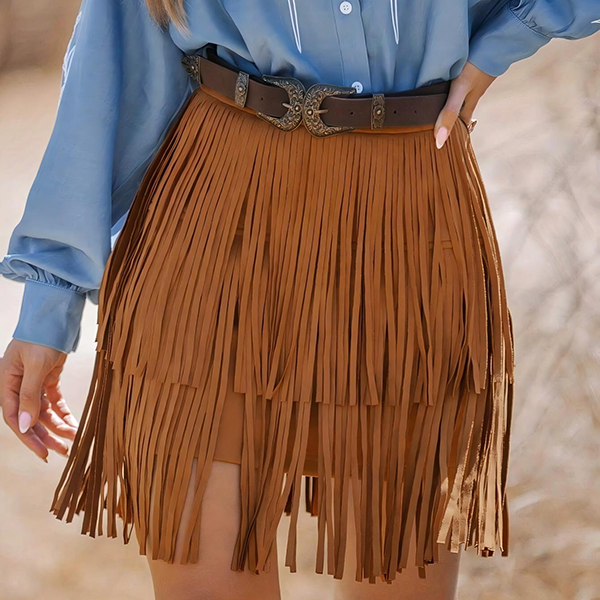 Chic bohemisk kjol med hög midja, dekorativa tofsar och trendig vintagekänsla. Tillverkad i lätt, följsamt material med förstklassig sömnad som garanterar maximal komfort. Unika tofsdekorationer accentuerar midjan och ger en livfull detalj som skiljer sig från massproducerade modeller. Passar perfekt med en åtsittande topp och ankelboots för en sofistikerad retrolook. Finns i flera stilrena färger – din nya favorit för både vardag och fest.