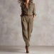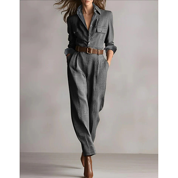 Denna jumpsuit har ett tidlöst rutmönster, en strukturerad ståkrage och funktionell knäppning fram för en vintageinspirerad och samtidigt modern elegans. Den rutiga designen ger klassisk charm och en traditionell känsla, medan ståkragen framhäver en raffinerad halsringning och skapar en professionell, sofistikerad stil. Vill du ha en?