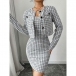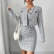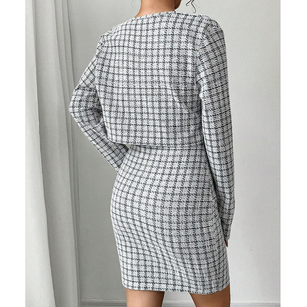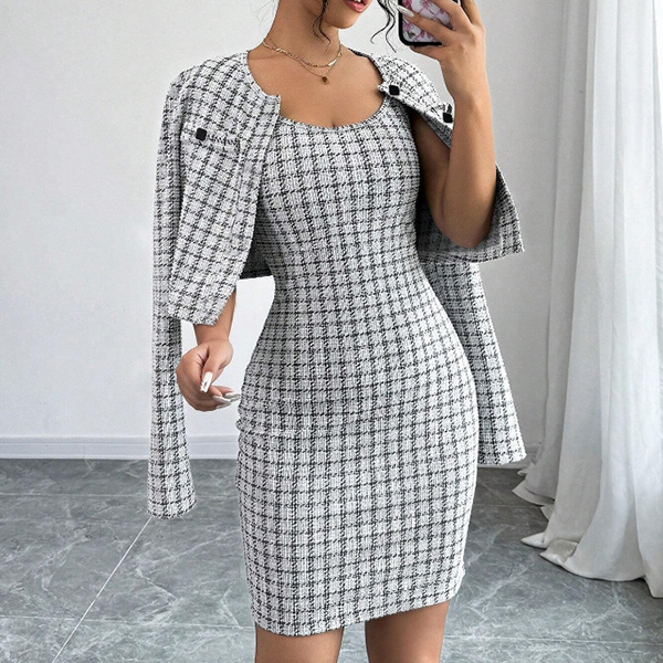 Tvådelat vintage-rutigt set med kort jacka och figurnära klänning