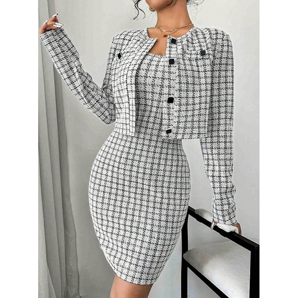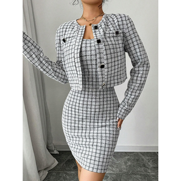 Tvådelat rutigt set med matchande cropjacka och figurnära klänning – en perfekt kombination av vintageelegans och modern edge. Setet är tillverkat i högkvalitativt, mjukt tyg som formar sig efter kroppen och behåller sin struktur tvätt efter tvätt. Cropjackan har kort, boxig passform med klassiska slag och eleganta knappar, medan klänningen framhäver siluetten med knälång längd och dold dragkedja i ryggen. Den unika rutdesignen ger en tidlös retrocharm som skiljer dig från mängden. Matcha med mary jane-skor, pärlörhängen och en liten handväska för en autentisk 60-talsinspirerad look som tar dig från kontor till afterwork med stil.