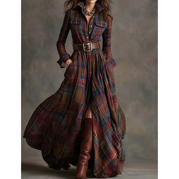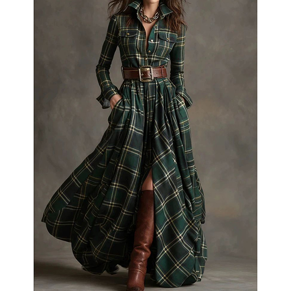 Maxiklänning i rutmönster, vintage-stil, långärmad med stående krage, slits framtill och medföljande skärp
