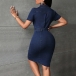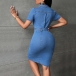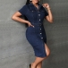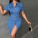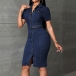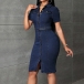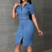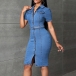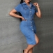 Figurnära vintage denimklänning med stående krage, korta ärmar, knäppning framtill och midjedragkedja