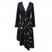 Denna romantiska klänning har en elegant V-ringning, klassisk knappdekoration och förtrollande blommönster som ger en vintageinspirerad, feminin sofistikering. Den oregelbundna fållen skapar en dynamisk, asymmetrisk rörelse och ett modernt, böljande utseende. Vill du ha den?