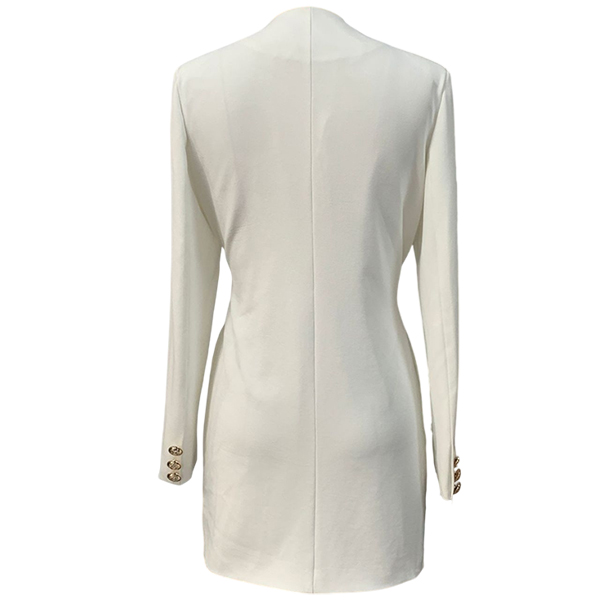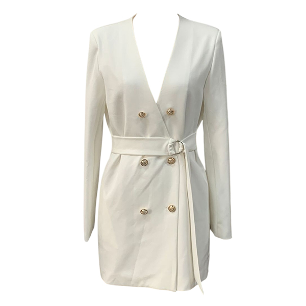 Denna vita klänning är ett sofistikerat och snyggt plagg som utstrålar elegans och förfining. V-ringningen erbjuder en smickrande och klassisk halsringning som ger klänningen en touch av lockelse och sofistikering, vilket skapar en elegant och polerad estetik. Den dubbelknäppta designen ger klänningen ett strukturerat och skräddarsytt element, vilket skapar en sofistikerad och tidlös look som är perfekt för att ge din outfit en touch av sofistikering. Den självknäppta midjedetaljen ger en feminin och figursmickrande touch, så att du kan knyta åt midjan för en skräddarsydd och smickrande passform. Kombinera den med klackar och iögonfallande smycken för ett formellt evenemang eller speciellt tillfälle, eller bär den med platta skor eller stövlar för en mer avslappnad men ändå elegant ensemble.