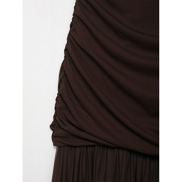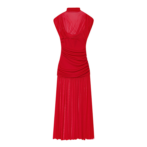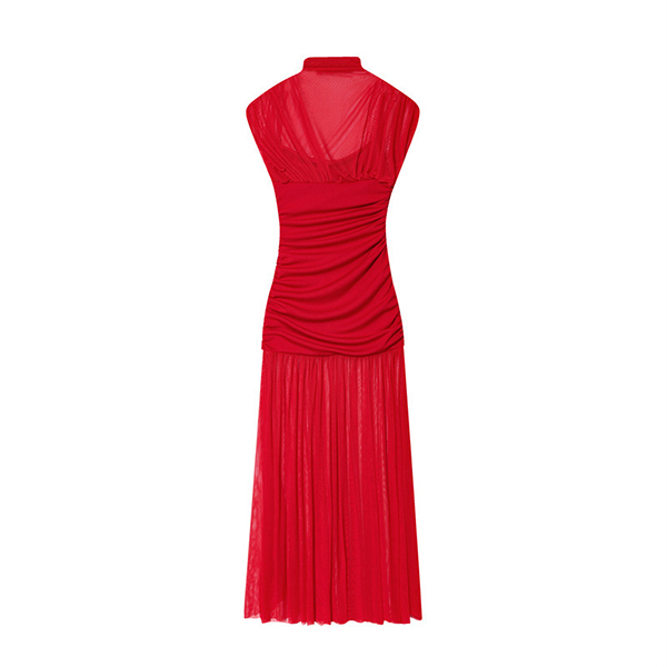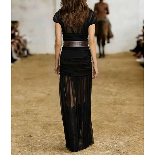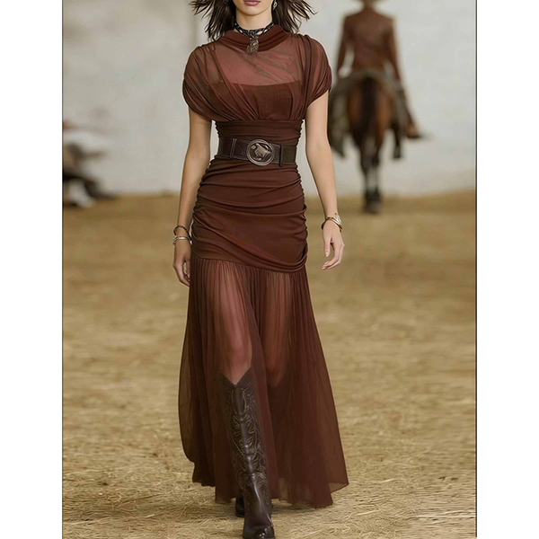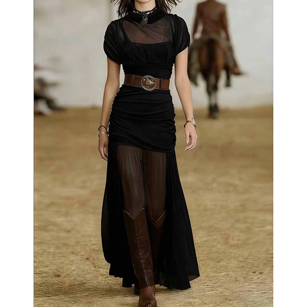Denna eteriska klänning utstrålar en romantisk, västerländsk bohemisk stil med en delikat, skir konstruktion och ett graciöst mesh-överlägg som ger modern prärieelegans. Den sänkta midjan skapar en avslappnad vintagecharm och smickrande proportioner, medan den skira, böljande fållen ger dramatisk rörelse och eterisk finess. Perfekt för festivaltillfällen, bohemisk stil eller sofistikerad präriekoordination.