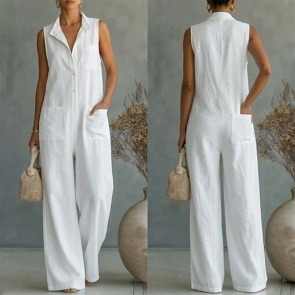 Enkel sommaravslappning – den vita jumpsuiten. Omfamna sommarens frihet med denna ultraavslappnade, ärmlösa jumpsuit. Plagget är designat för den moderna minimalisten och kombinerar struktur från brukskläder med mjukheten från resortkläder.