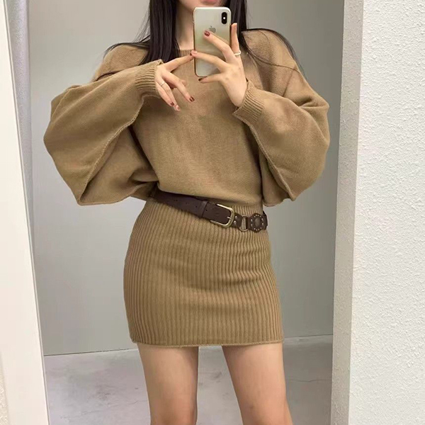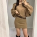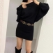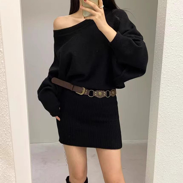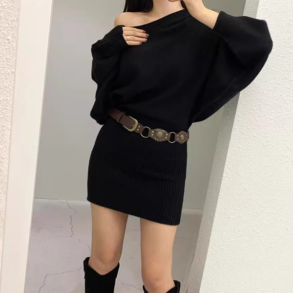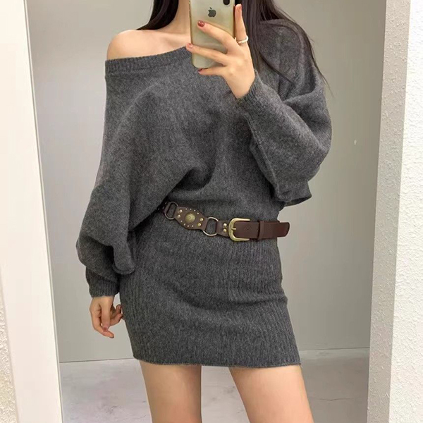 Tröjklänning dam – asymmetrisk sned halsringning, långärmad bodycon med fladdermusärm och skärp