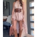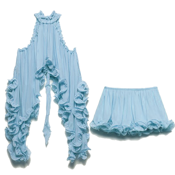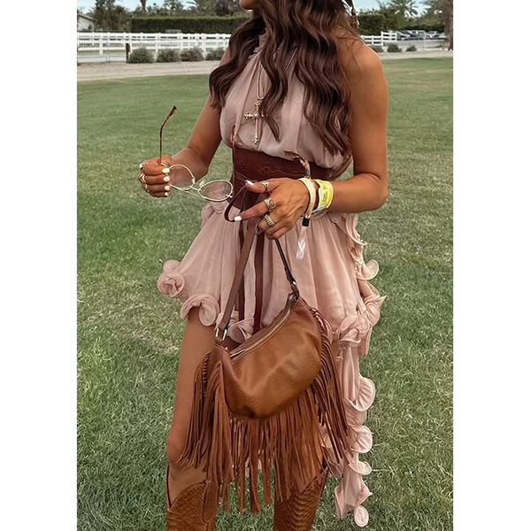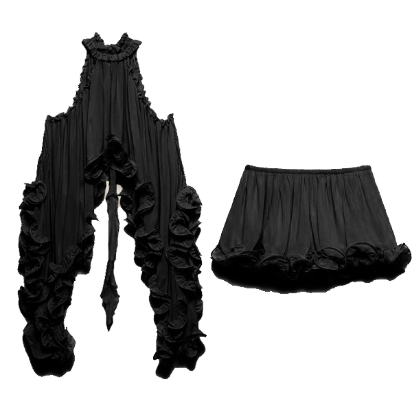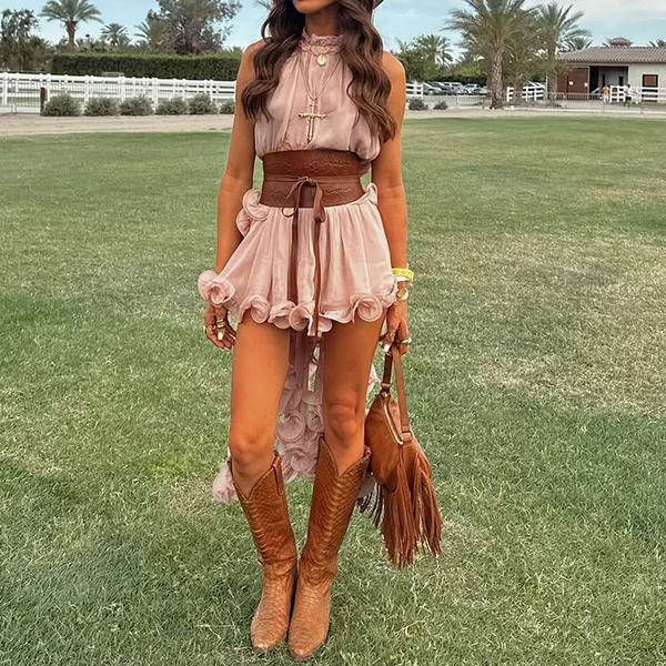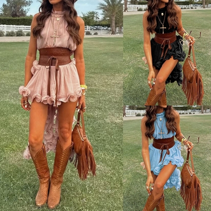 Omfamna din fria själ med vårt hisnande Prairie Wind Ruffle Set. Designat för bohemen i hjärtat: denna tvådelade ensemble har en ärmlös topp med hög hals och en dramatisk, asymmetrisk hög-låg-fåll som böljar mjukt när du rör dig. Matchad med en skiktad volangkjol skapar det lätta, luftiga tyget en romantisk, kaskadformad silhuett. Perfekt för sommarens musikfestivaler, strandresor eller countrykonserter.
