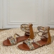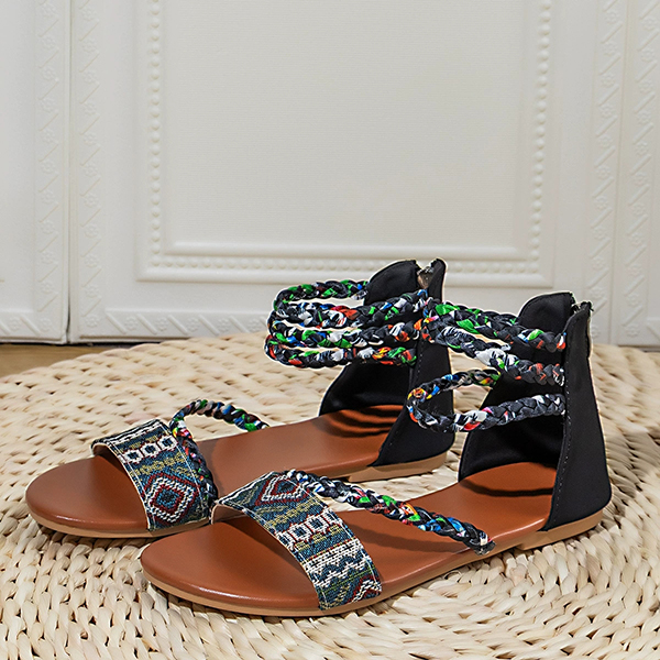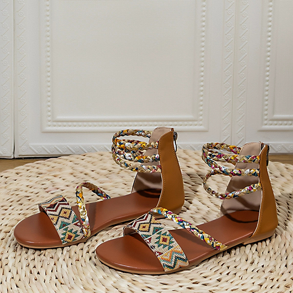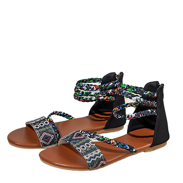 Sandaler för dam – Boho-tribal vävda platta gladiatorsandaler med färgglad flätning, rem och bakre dragkedja