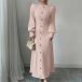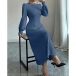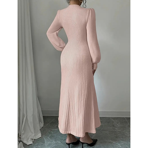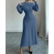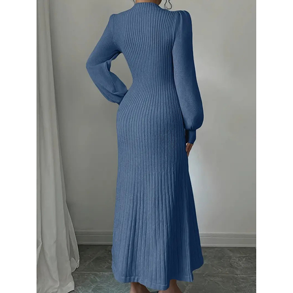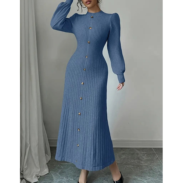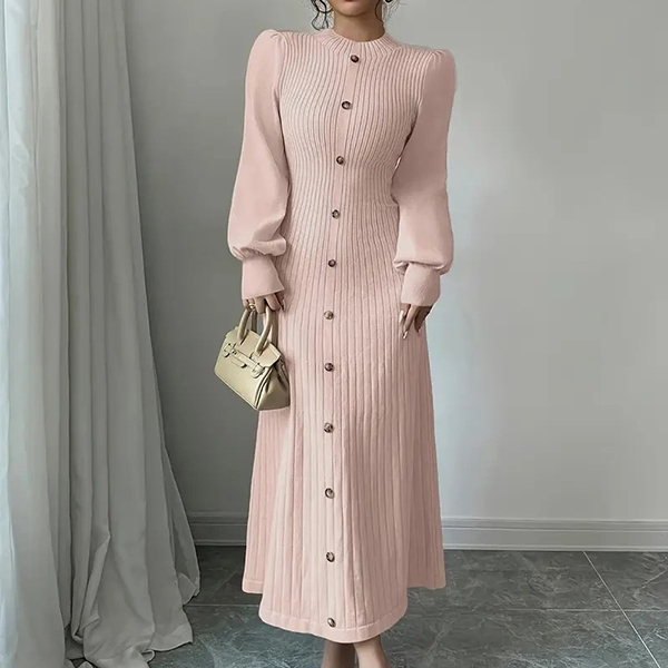 Denna ribbstickade klänning har en klassisk rund halsringning, texturerad ribbstickning och en graciös A-linjeformad silhuett som ger modern och bekväm elegans. De långa lanternärmarna tillför dramatisk volym och romantisk charm, medan knapparna framtill ger en tidlös look. Kombinera med tofflor och vintageaccessoarer för en sofistikerad och bekväm stil.