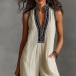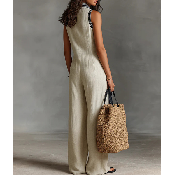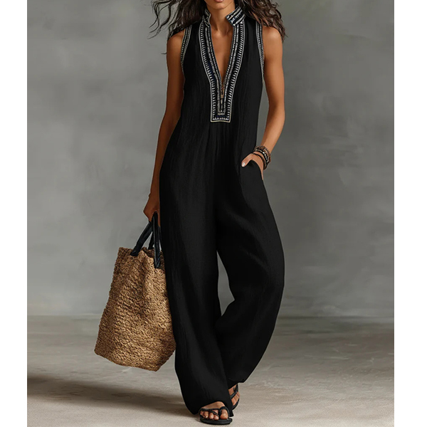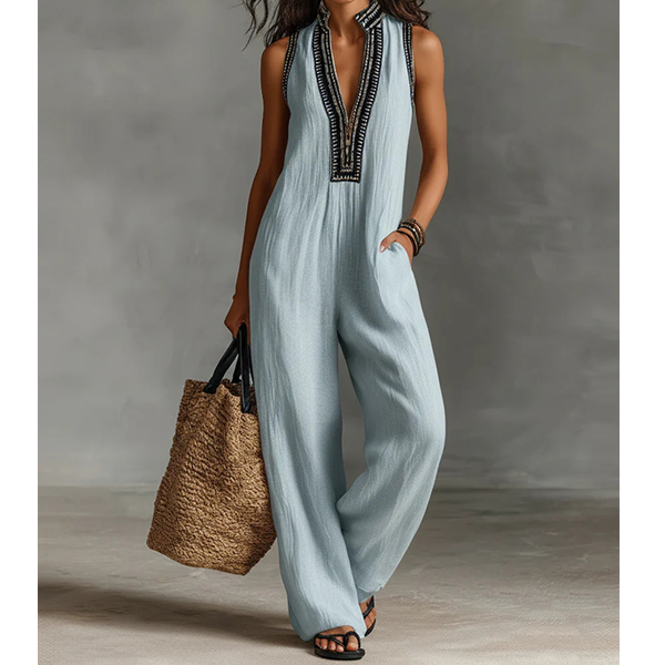 Damjumpsuit med djup V-ringning, boho-stil, ärmlös, vida ben och praktiska fickor