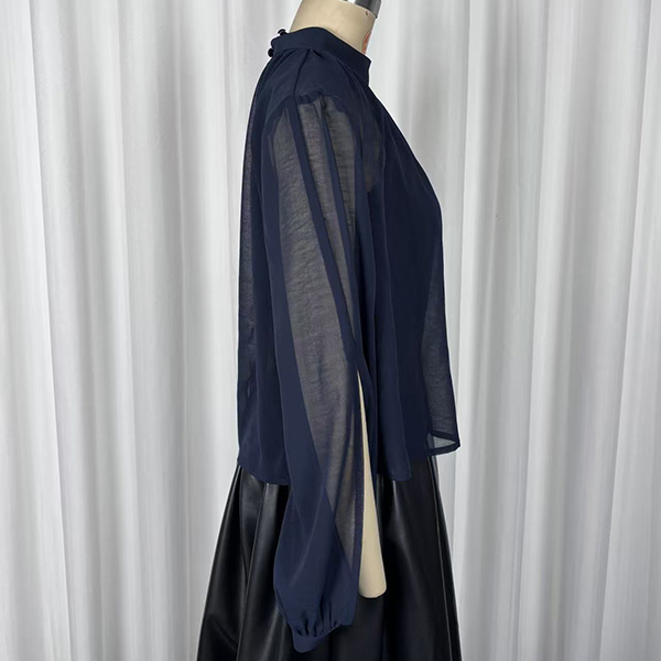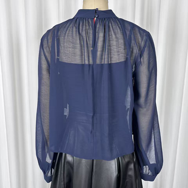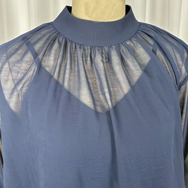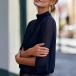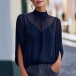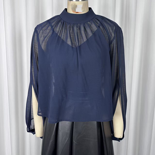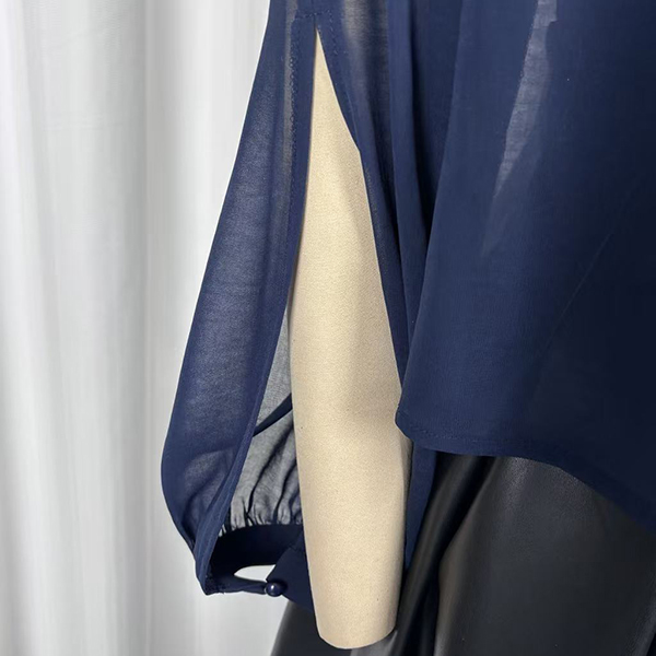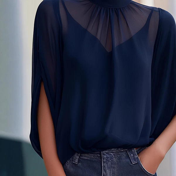 Uppnå enkel sofistikering med detta Breeze tvådelade blusset. Designat för den moderna kvinnan som värdesätter både stil och komfort, består setet av ett vackert draperat, halvtransparent ytterlager som är perfekt färgmatchat med ett bekvämt innerlinne. Den eleganta, imiterade halsringningen framhävs av delikata veck som skapar ett följsamt och smickrande fall över överdelen. Dramatiska ärmar med öppen slits ger en capeliknande effekt och tillför luftig rörelse samt en elegant, modern silhuett. Oavsett om du stoppar in den i skräddarsydda byxor för ett möte eller matchar med dina favoritjeans för en helgbrunch, övergår detta marinblå set sömlöst från dag till kväll.