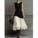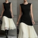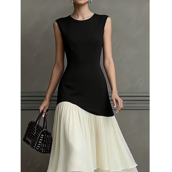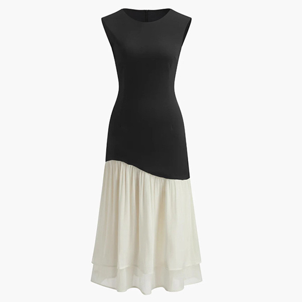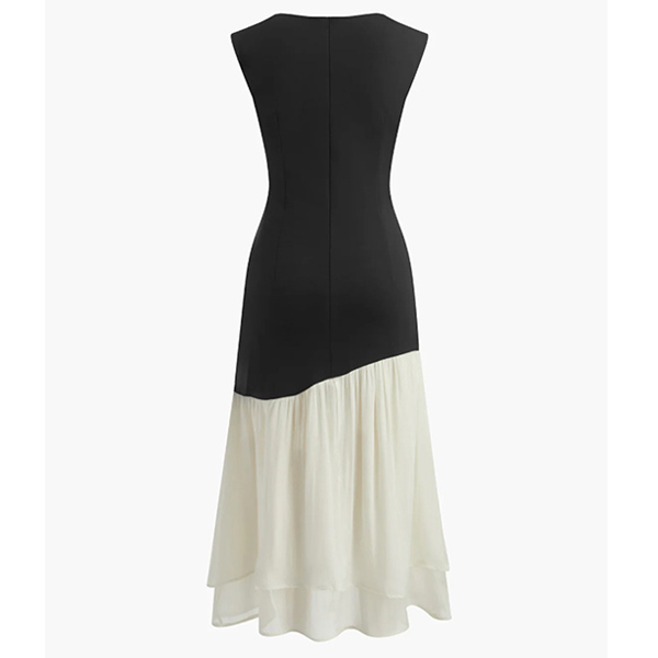 Gör ett djärvt uttalande med denna färgblocksklänning, designad för kvinnan som uppskattar modern konst och tidlös stil. Den sofistikerade svarta överdelen möter en böljande vit kjol i en unik diagonal skärning. Denna asymmetriska skarv skapar en smalnande optisk illusion som smickrar varje kurva. Oavsett om du ska på sommarbröllop, företagsevenemang eller en fin middagsdejt garanterar denna klänning att du ser elegant och balanserad ut.