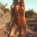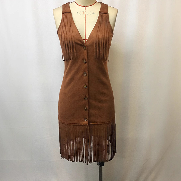 Den här klänningen har en autentisk westernstil i lyxig konstmocka och dynamiska fransdetaljer som ger en modern cowgirl-elegans. Kombinera den med cowboystövlar och westernaccessoarer för en autentisk cowgirl-känsla.