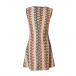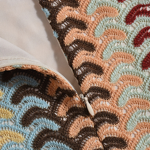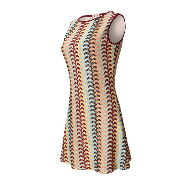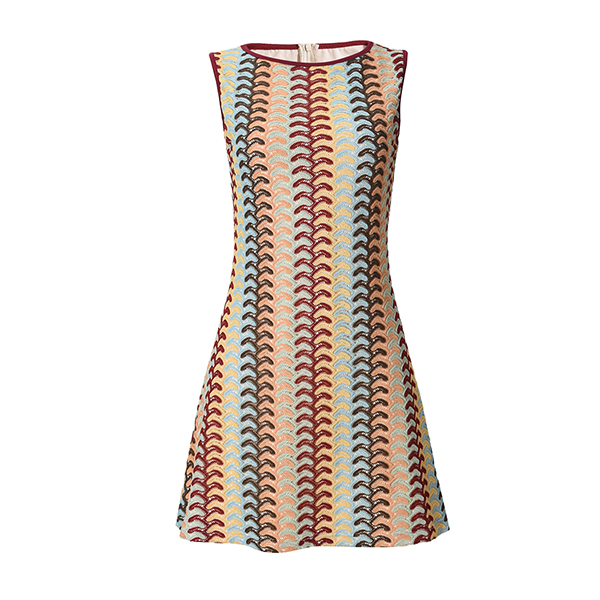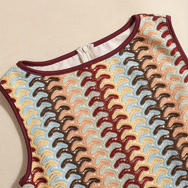 Väck din inre 70-talsmusa med denna vågiga stickade, ärmlösa miniklänning. Detta livfulla plagg är en hyllning till retrostil, med ett vackert texturerat, flerfärgat vågmönster som omedelbart fångar blicken. Oavsett om du ska till en sommarfestival, en strandbrunch eller en takfest, garanterar den här klänningen en groovy och iögonfallande look.