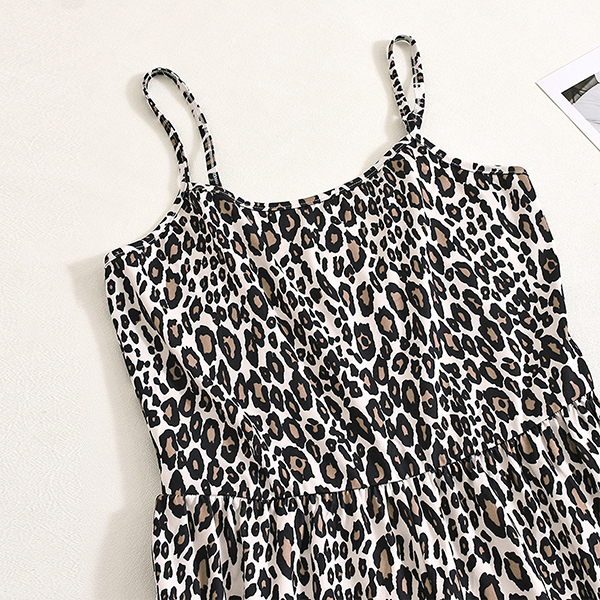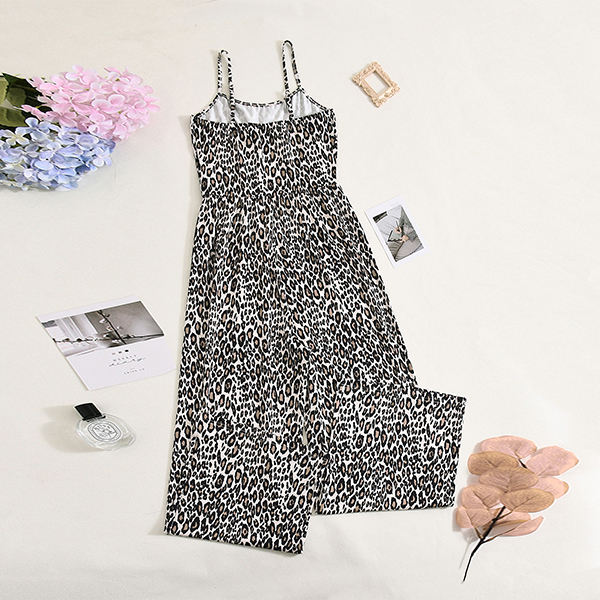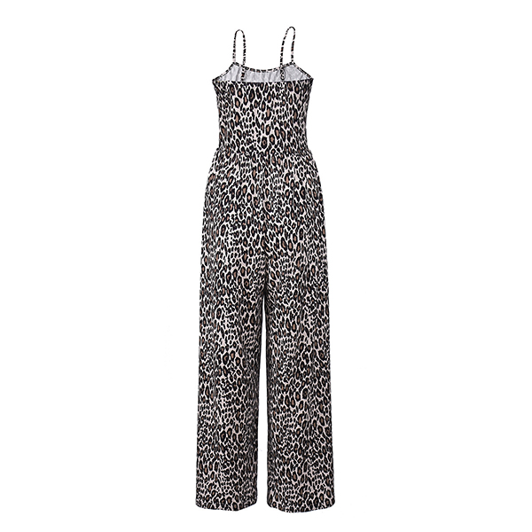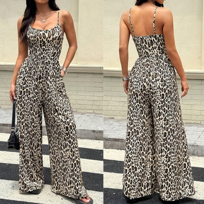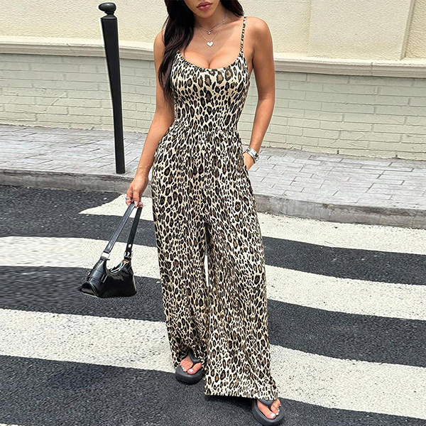 Leopardmönstrad jumpsuit dam – sexig sommaroutfit med tunna spaghettiband, vida ben och fyrkantig halsringning