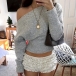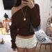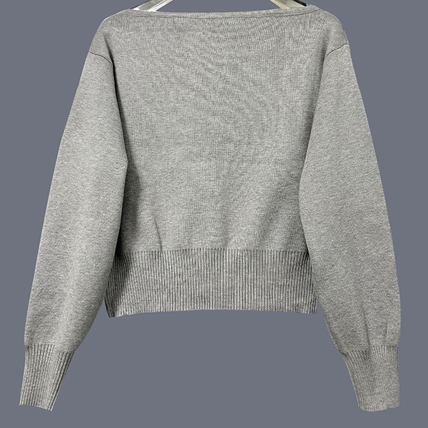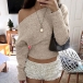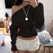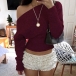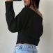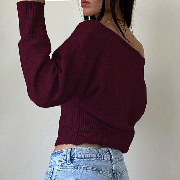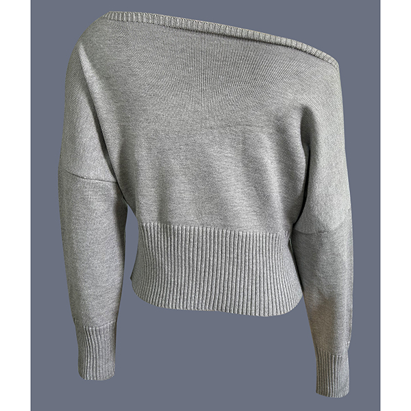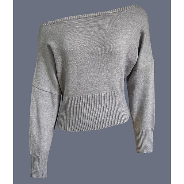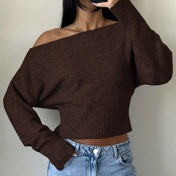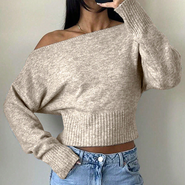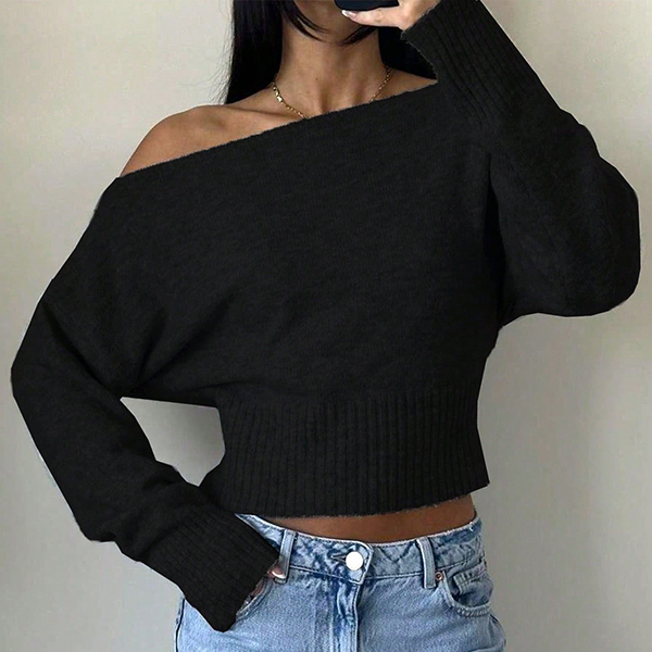 Stickad damtopp med dolmanärm och en axel – lös, kort topp med bred ribbad fåll och figurnära midja