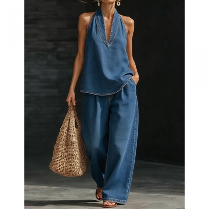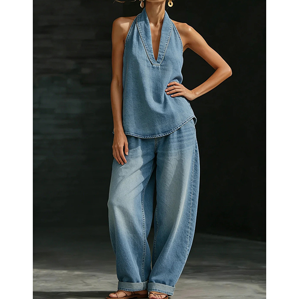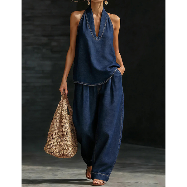 Denimset i två delar – ärmlös halterneck-topp med V-ringning och matchande vida byxor