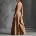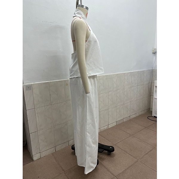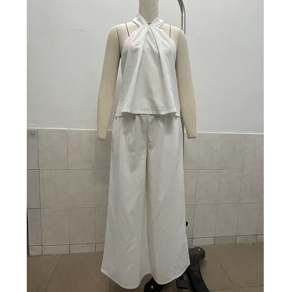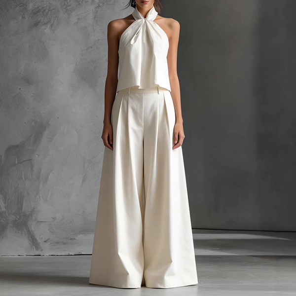 Omfamna avslappnad sommarelegans med detta fantastiska tvådelade set. Designat för den moderna minimalisten, med en elegant halterneck-topp och en sofistikerad, vriden detalj som skapar ett vackert, avslappnat fall. Kombinera den med dramatiska, ultravida byxor som faller mjukt och rör sig elegant med varje steg. Oavsett om du promenerar genom en kuststad eller är på väg till en elegant helgbrunch är detta set din genväg till omedelbar chic.