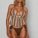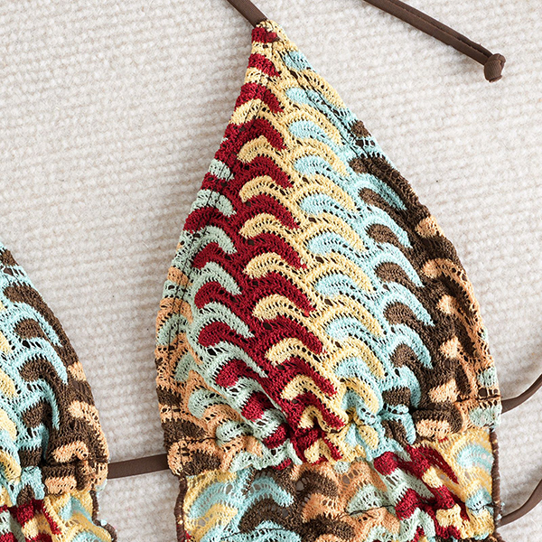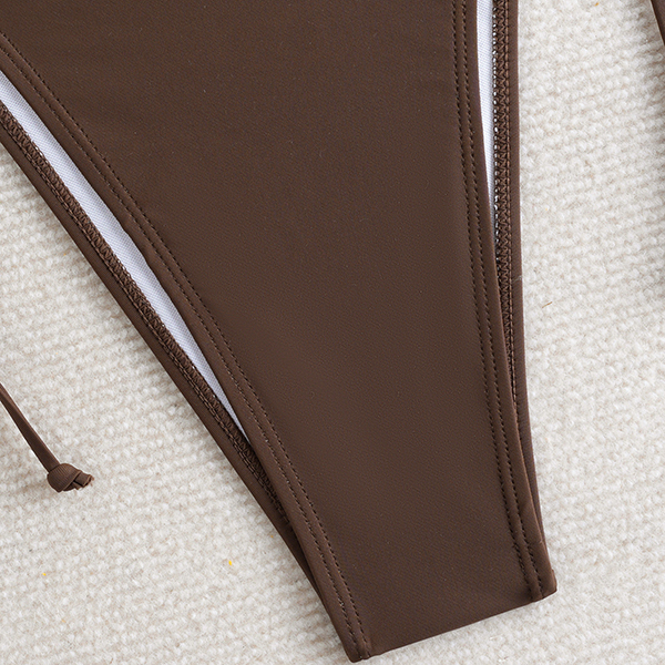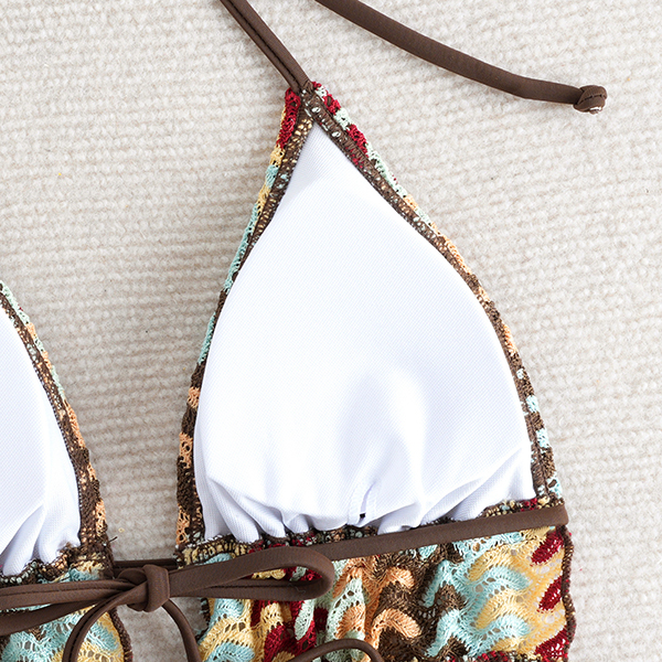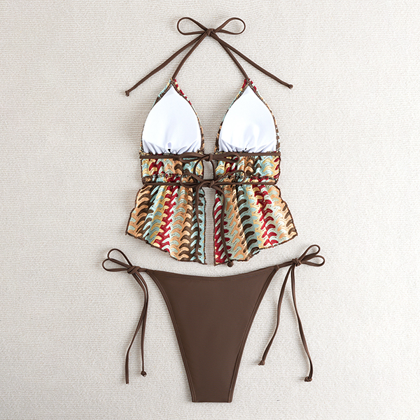 Denna unika tvådelade baddräkt är en mästarklass i bohemisk stil, med en iögonfallande halterneck-topp i ett texturerat, jordnära chevronmönster. Toppen har en djup V-ringning och en smickrande, slitsad peplumkant som ger en lekfull rörelse till din strandlook. Tillsammans med klassiska, enfärgade chokladbruna bikinitrosor med knytband i sidan ger setet en fullt justerbar passform som framhäver dina kurvor perfekt. Oavsett om du kopplar av på en ökenresort eller njuter av solen vid en tropisk kust, ger denna baddräkt en enastående silhuett.