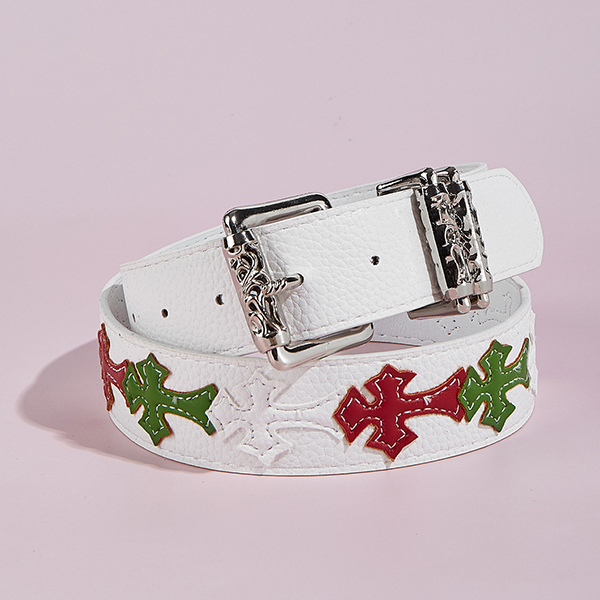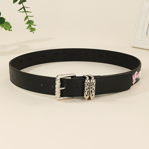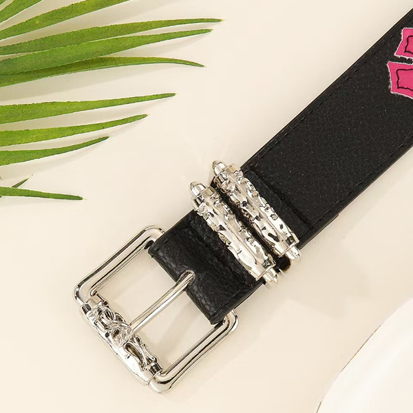 Släpp lös din inre rebell: Y2K-bältet med korsmönster Ge din outfit en rejäl dos attityd med detta punkinspirerade konstläderbälte. Bältet kanaliserar det bästa från tidigt 2000-tal, grunge och modern e-girl-estetik och har en slående rad sydda korsapplikationer i nyanser av starkt rosa, mjukt rosa, vitt och brunt. Den texturerade svarta remmen avslutas med ett kraftigt, utsmyckat silverspänne med invecklad gravyr, vilket ger en högkvalitativ vintagekänsla. Det är det perfekta uttalandeplagget för att bryta upp en monokrom look eller fullända en djärv streetwear-ensemble.